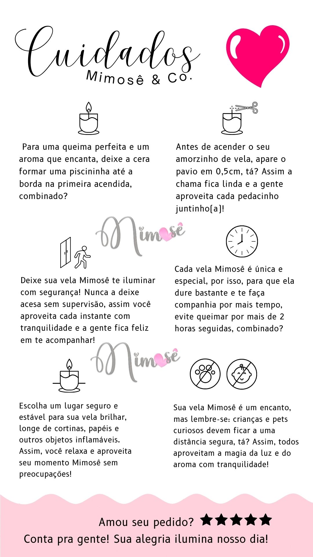 As velas Mimosê são feitas artesanalmente, com muito amor e carinho, usando ingredientes naturais e de alta qualidade, como cera vegetal de coco e essências premium. Cada vela é criada para proporcionar uma experiência única de bem-estar, aconchego e conexão com a sua essência.